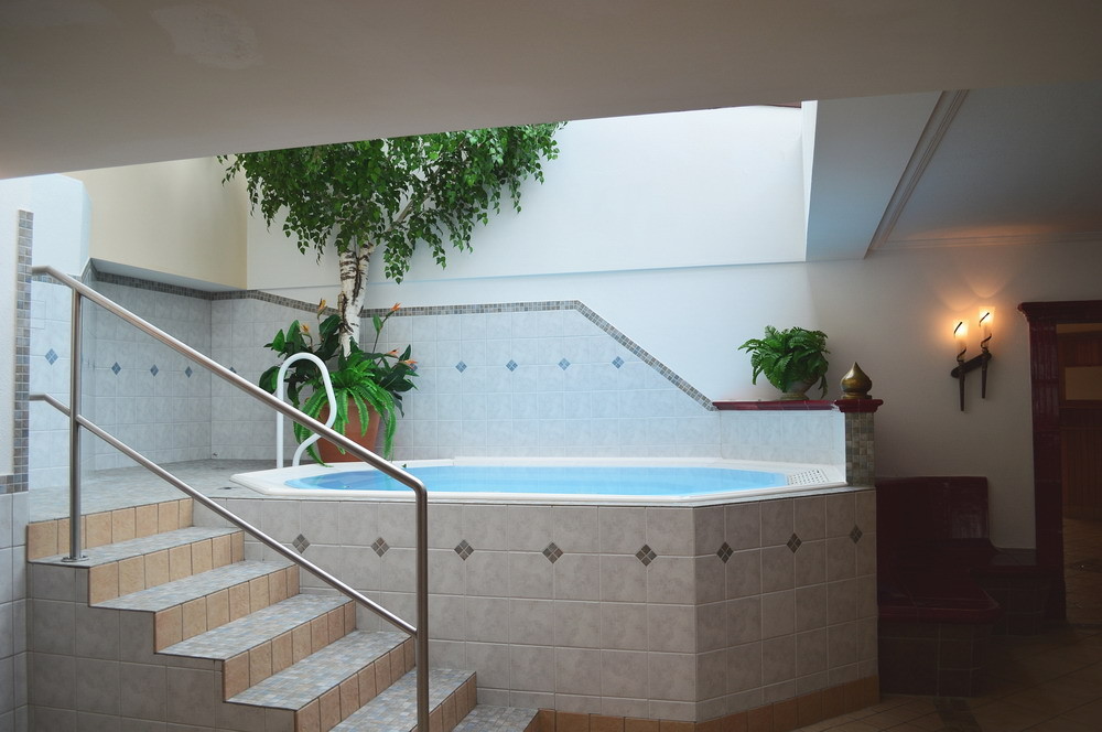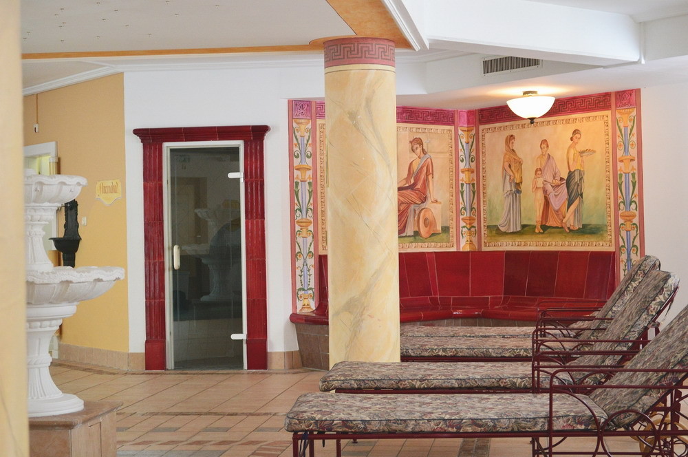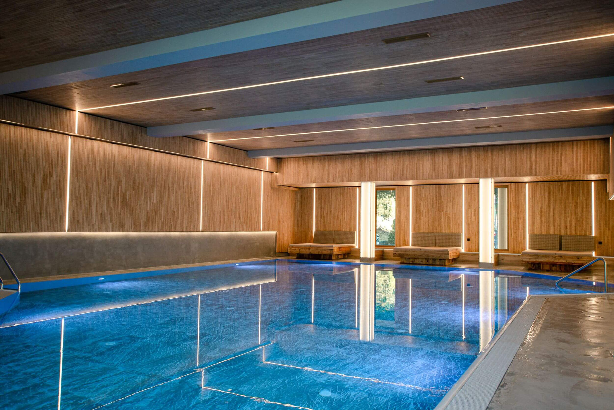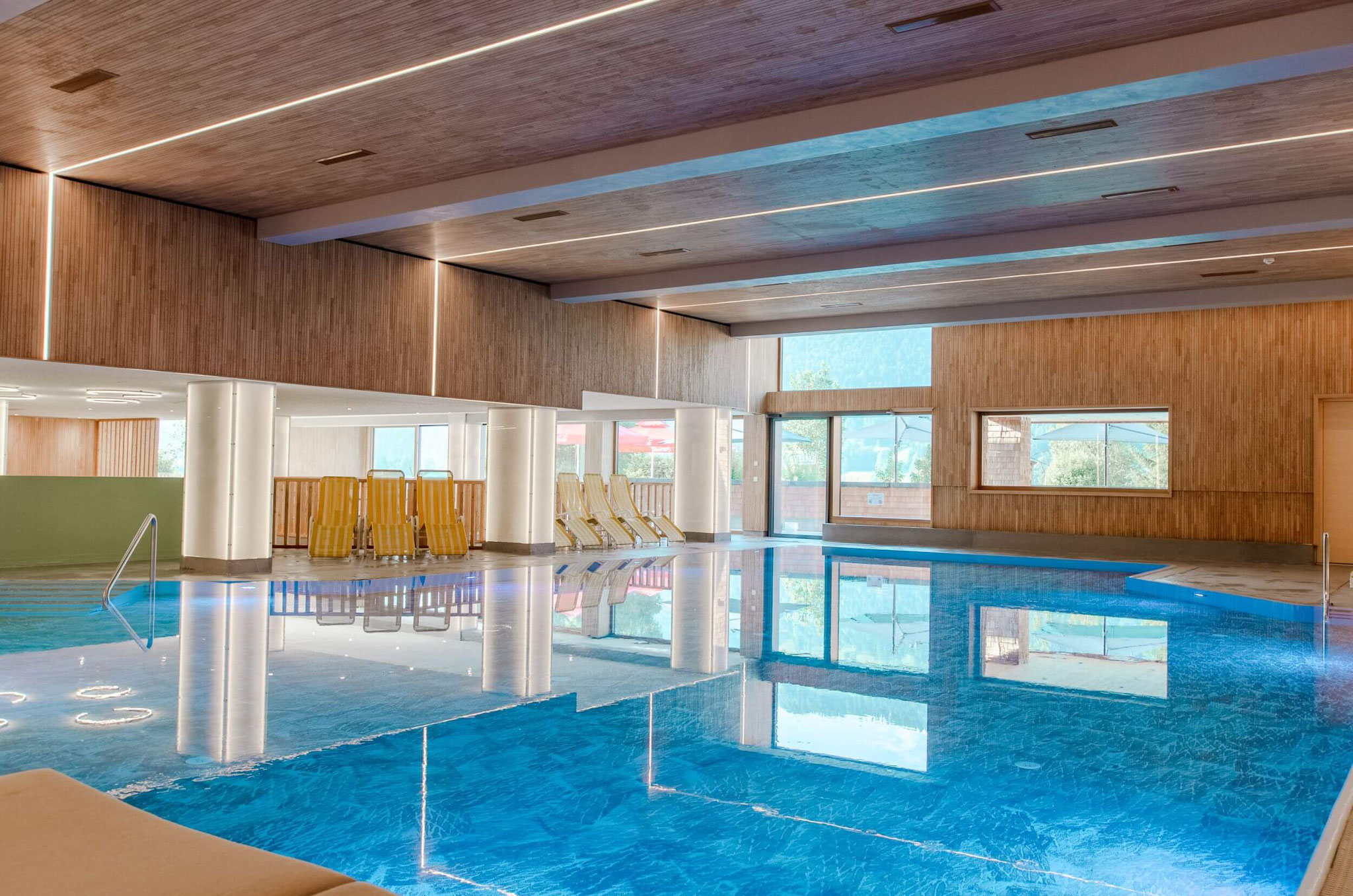 Hallenbad mit Kinderbecken, Saunalandschaft.