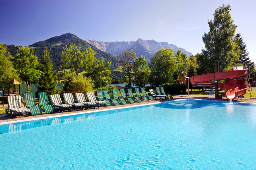 Im Sommer zusätzlich Freibad mit Wasserrutsche, große Liegewiese mit direktem Zugang zum Walchsee.